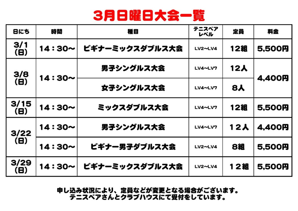2026年02月10日 3月大会エントリー受付中のお知らせ 大会情報 日頃より横須賀ダイヤランドテニスクラブをご利用いただき、誠にありがとうございます。 3月に開催を予定している大会をご紹介します! ただ今エントリー受付中です🎾 お申し込みはフロント・またはテニスベアさんよりお願いします。 大会開催情報・お申し込み 8fb4395976f40dcd67239b5765155816