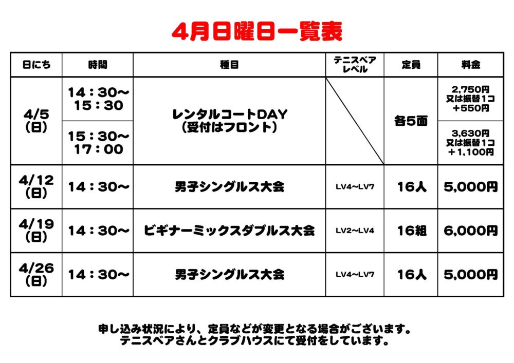 お申し込みはフロント・またはテニスベアさんよりお願いします。